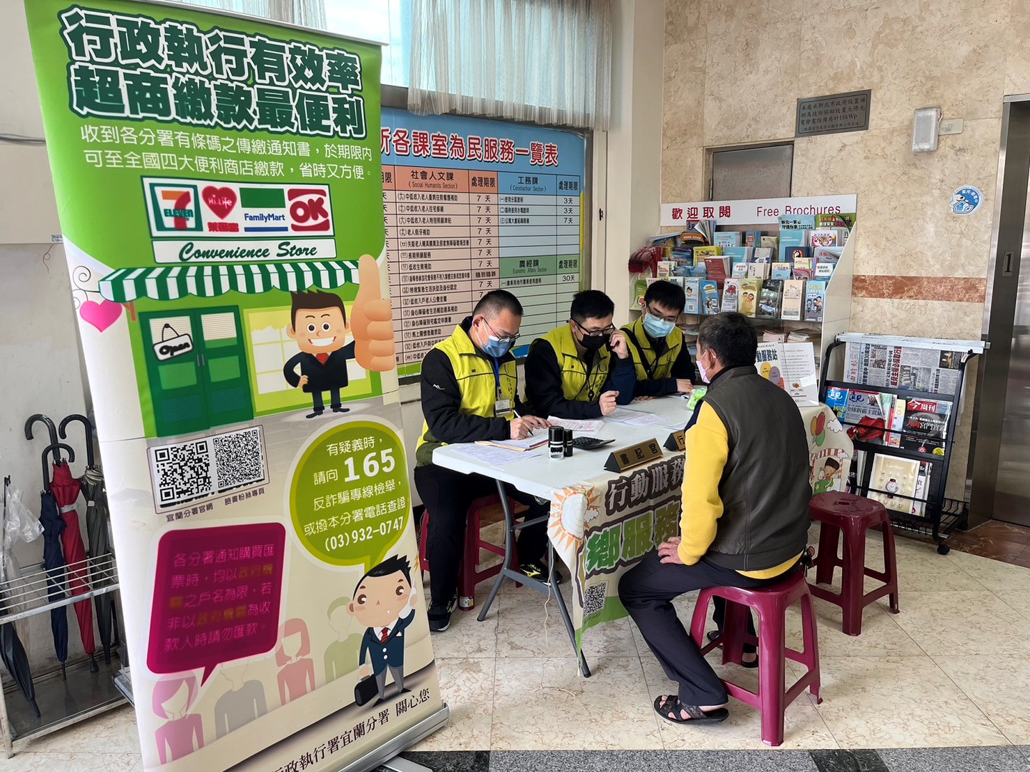 本分署112年度愛心巡迴服務第2站於2月9日由張執行官帶領下來到以老街、鴨肉及地瓜聞名的金山區,當日於上午10時至12時及下午13時30分至15時30分,在金山區公所1樓提供在地的諮詢與服務,如繳納執行案款、申請分期繳納、報告財產狀況及行政執行有關的法律諮詢。