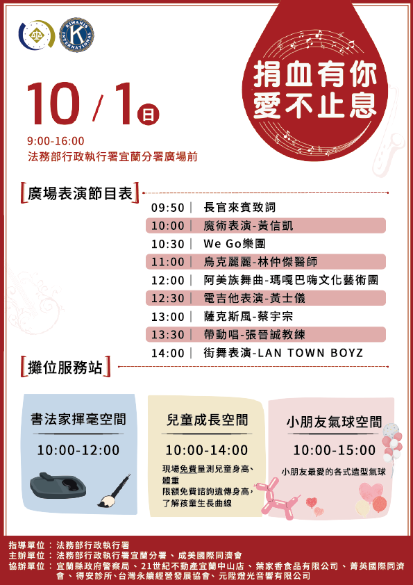 本分署與成美國際同濟會將於112年10月1日上午9時許至下午4時止,在宜蘭分署廣場前,舉辦「中秋蘭陽 揪愛去」義賣、捐血及多元藝術慈善表演活動,當日捐血250cc即可獲新月電影票1張,捐500cc可選擇2張電影票或價值650元之行政執行署吉祥物拍寶手機座或真空保溫瓶1支(詳照片一),數量有限,送完為止。義賣區攤位將販售各式物美價廉的生活用品及娛樂物件(詳照片二各種品項),琳琅滿目、應有盡有,此外,還有兩位書法家沈暨、陳佩苓在現場揮毫義賣。大門口舞台區另有各類多元藝術表演(詳節目流程表及DM),活動精彩可期,敬邀宜蘭鄉親及各界人士踴躍參與。