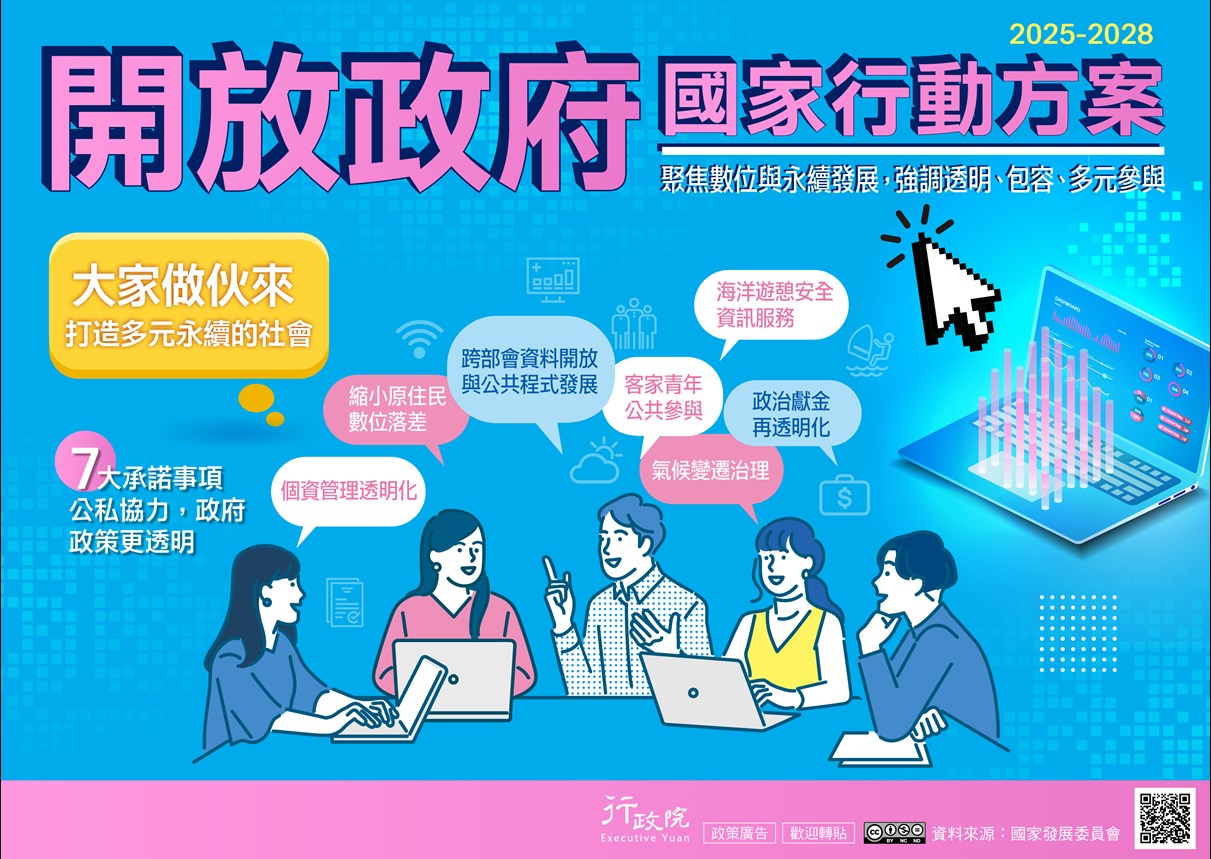 為持續深化民主素養,讓臺灣成為國際社會可靠的夥伴,政府再發布新一階段行動方案(2025-2028),透過公私協力機制,強化數位技術應用、擴大多元公民參與,並深化政策透明度。行政院特策製相關說明資料,請參閱。